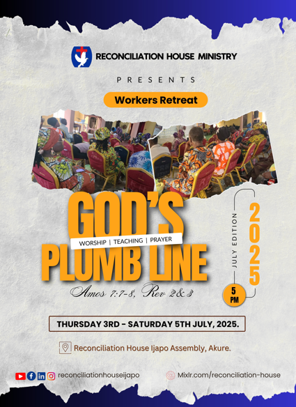 ๐ฅ WORKERS' RETREAT 2025 ๐ฅ๐ Dates: Thursday 3rd โ Saturday 5th July, 2025๐ Venue: Reconciliation House Ijapo Assembly๐ Theme: Godโs Plumb Line๐ Amos 7:7โ8 | .... Continue Reading